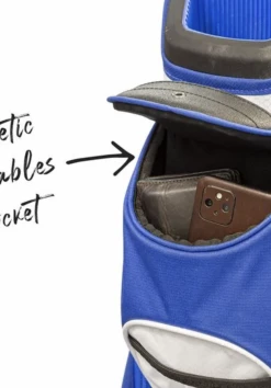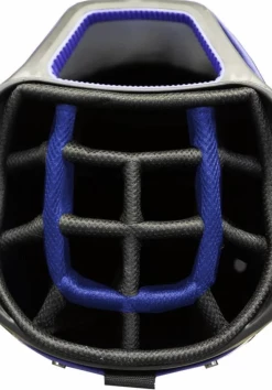 he Eze Gluide 84 Cart Bag is a premium cart bag with 14 Way Top and Zipperless magnetic Pocket. The Cart Bag is the pinnacle of cart bag majesty. Your clubs and accessories nestled safely in the lap of luxury. This bag features a 14 way diamond performance top with an oversized putter pit and a strong front handle. It also shows off 6 pockets, with 4 of them being zippered, a low profile OGIO ball silo, a zipperless ball pocket, valuables pocket, and an insulated water bottle pocket. If you are tired from walking and using the load equalizing shoulder strap, simply throw this bad boy on a cart and attach it through the cart strap channel.